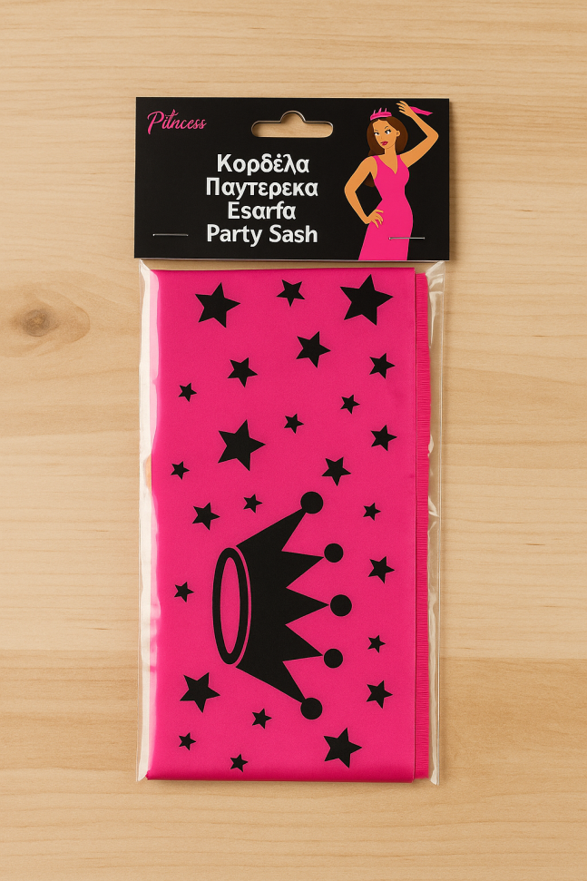 Парти лента в цикламен цвят с принт на звезди и корони и надпис Princess.