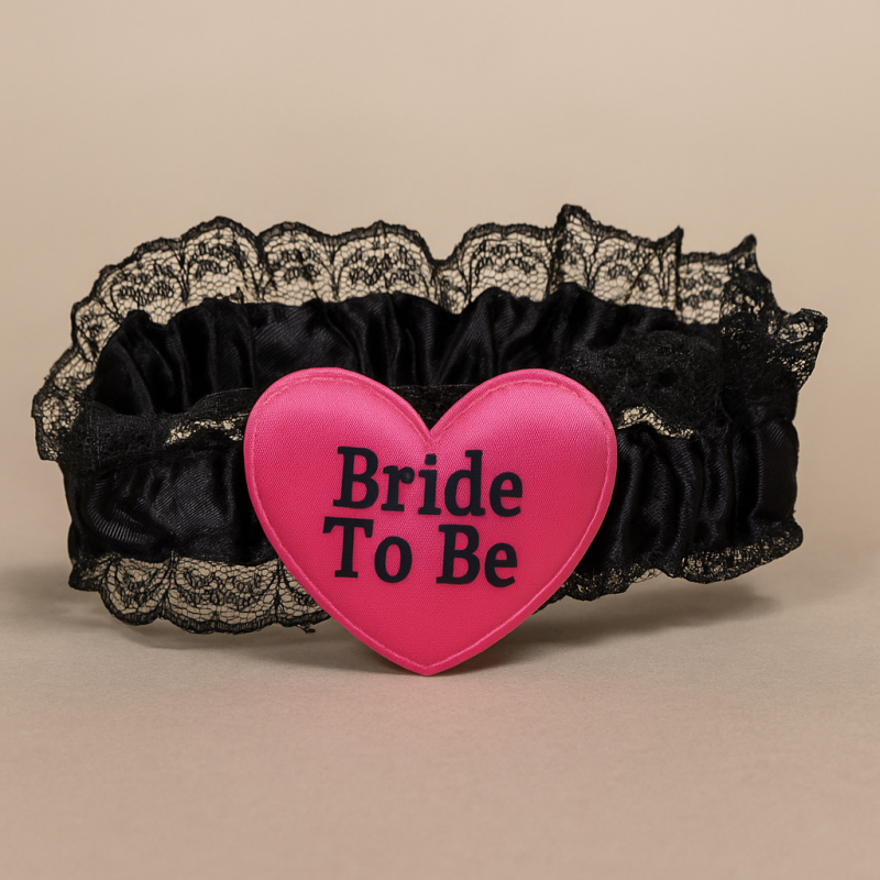 Парти жартиер за булка в черен цвят с дантела и цикламено сърце.