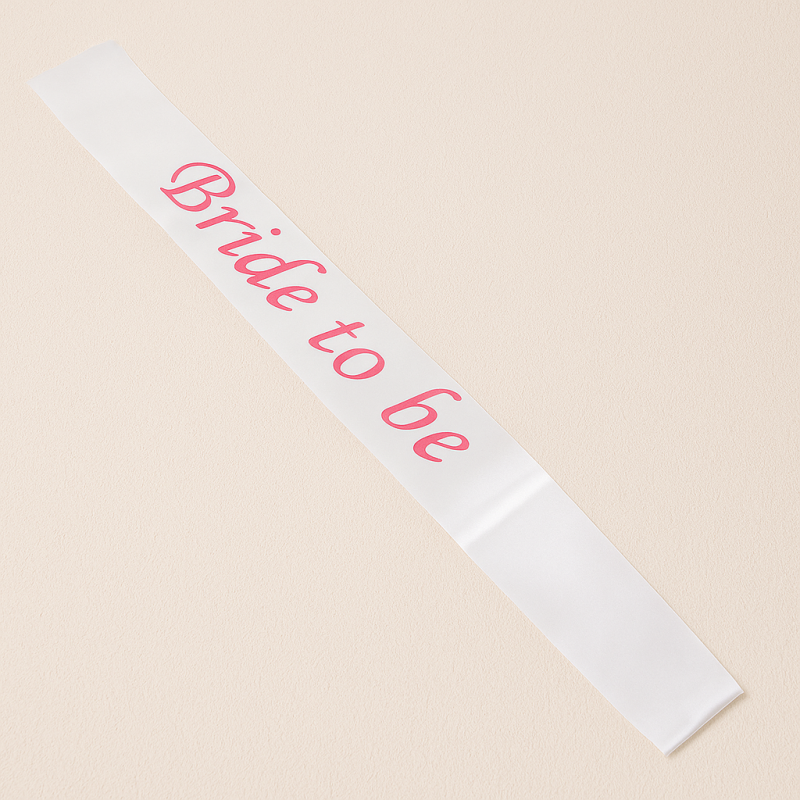 Парти лента за булка, изработена от сатен в бял цвят с цикламен надпис Bride to be.