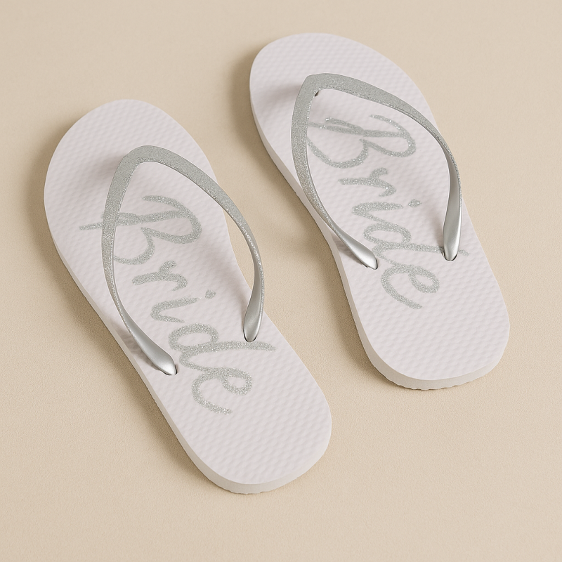 Парти джапанки за булка в бял цвят със сребрист надпис Bride и каишки с блестящи брокатени частици в сребрист цвят.
