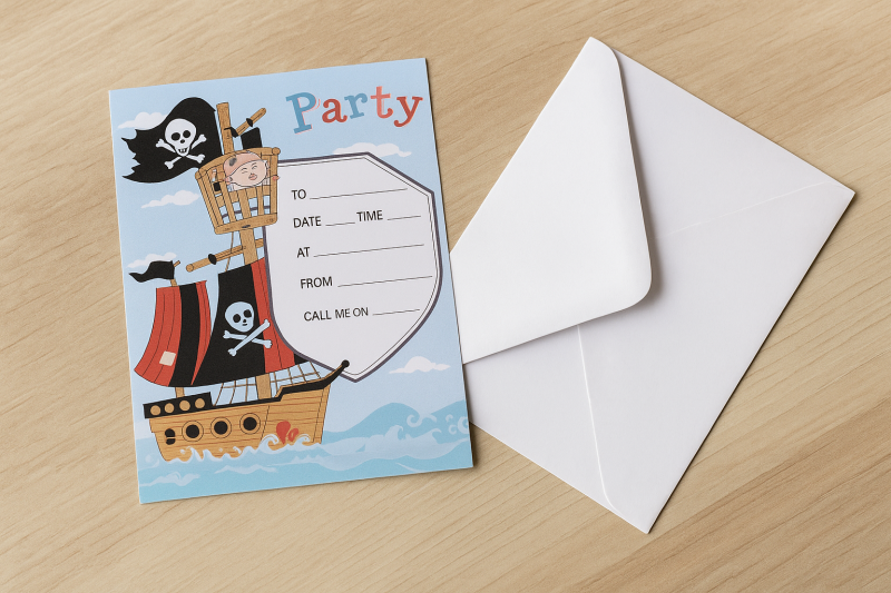 10 броя детски покани за рожден ден или детско парти с картинка на пиратски кораб в комплект с хартиени пликове.