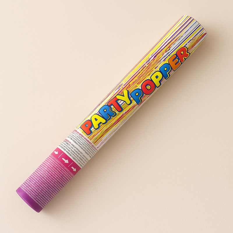 Пластмасов цилиндър с многоцветни металик лентички и конфети с въздух под налягане, който ги изстрелва на височина от 4 до 7 метра.