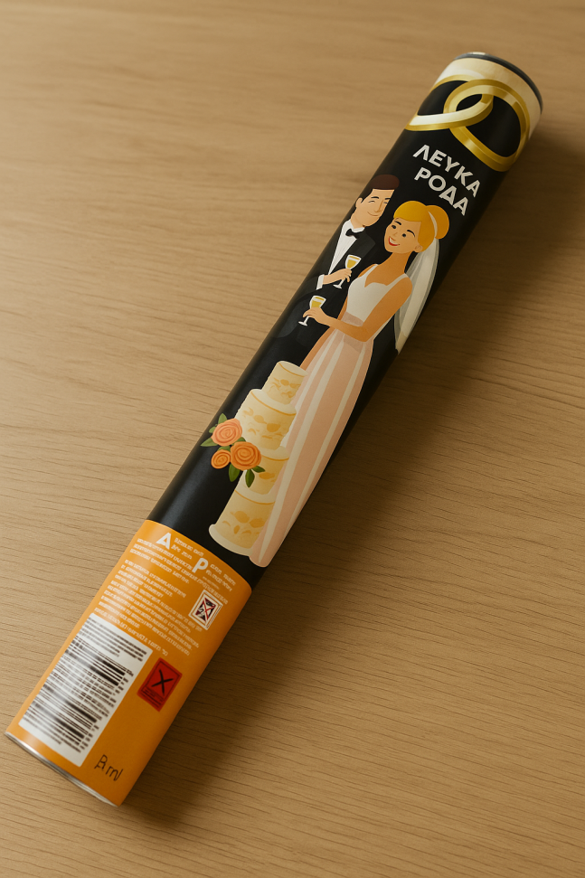 Пластмасов цилиндър със сватбени конфети във формата на сърца с въздух под налягане, който ги изстрелва на височина от 4 до 7 метра.