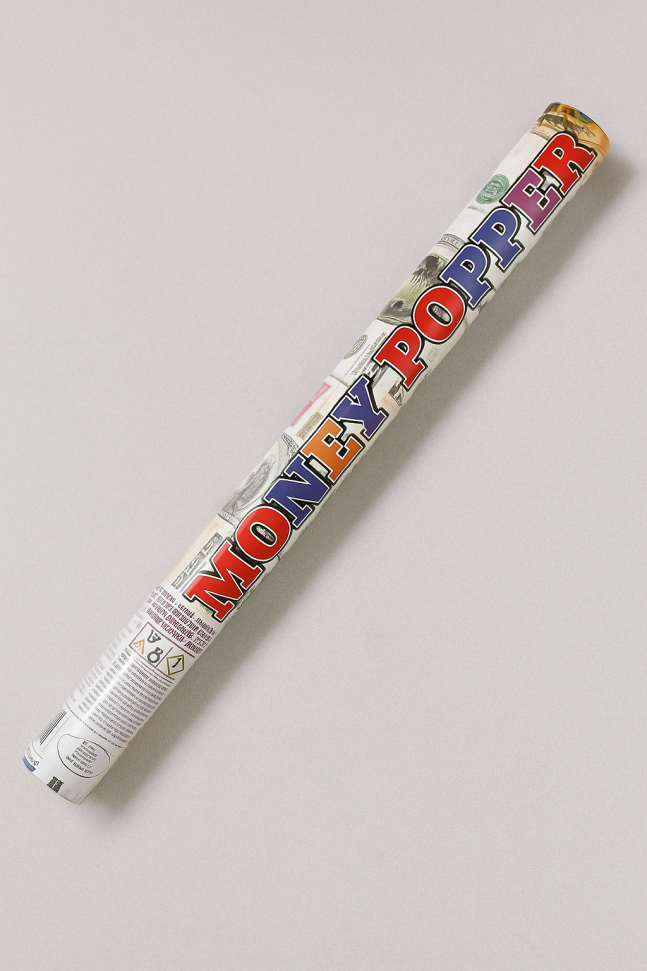 Парти цилиндър с многоцветни металик лентички и конфети във формата на банкноти с въздух под налягане, който ги изстрелва на височина от 4 до 7 метра.