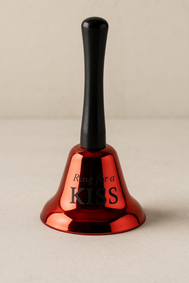 Парти звънче с дръжка, изработено от метал в червен цвят със забавен надпис.