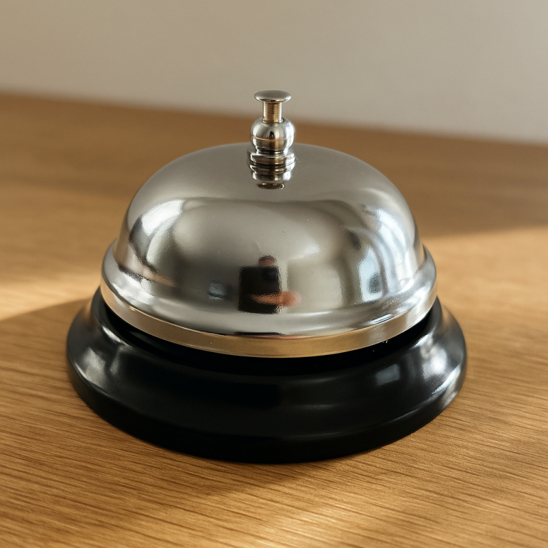 Настолен парти звънец, изработен от метал в сребрист цвят.