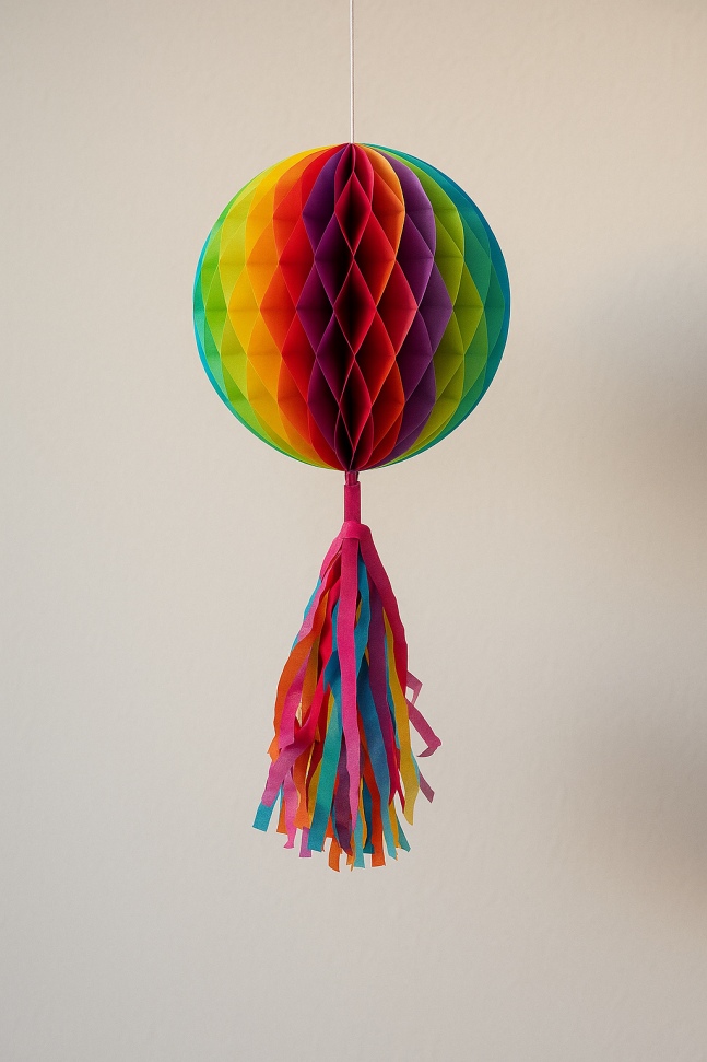 Висяща парти декорация във формата на многоцветна топка с ресни, изработена от хартия.