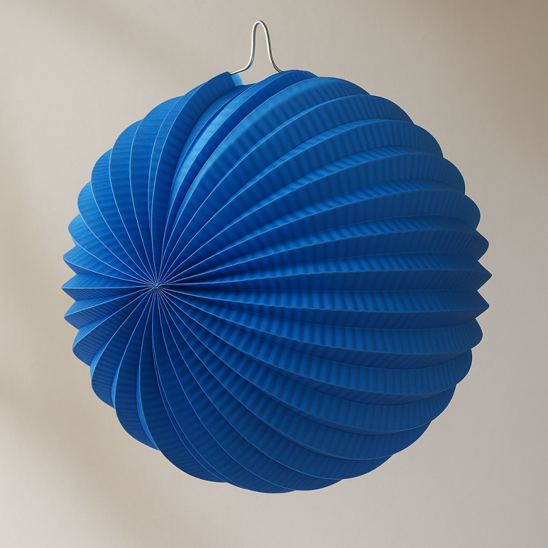 Висяща парти декорация във формата на топка, изработена от хартия в син цвят с телен корпус, за да стои отворена.