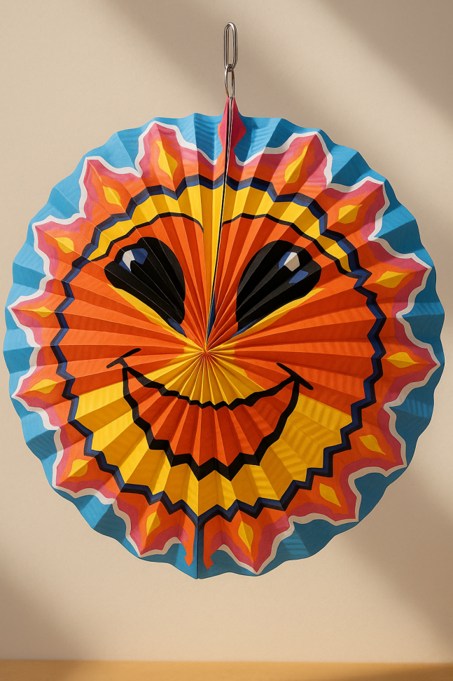 Висяща парти декорация във формата на усмихнато слънце с телен корпус, за да стои отворена.