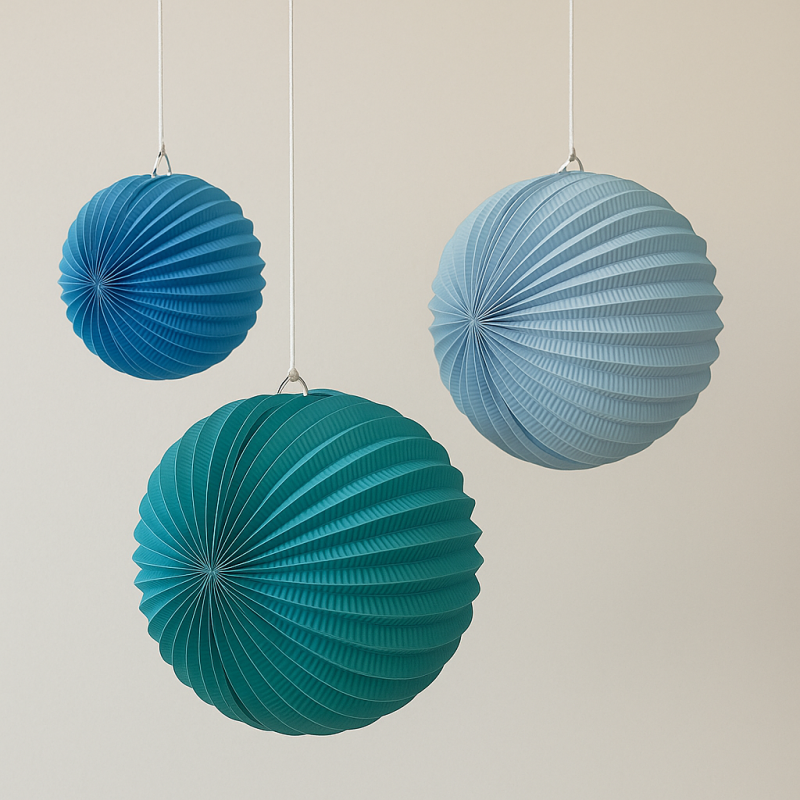 Комплект от 3 броя висящи парти декорации във формата на топка, изработени от хартия в сини нюанси с телена рамка, за да стоят отворени.