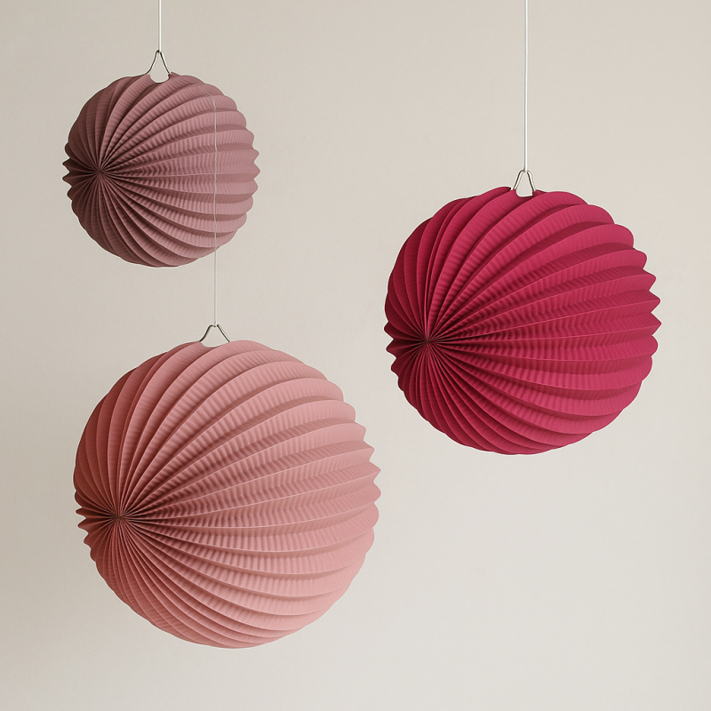 Комплект от 3 броя висящи парти декорации във формата на топка, изработени от хартия в розови нюанси с телена рамка, за да стоят отворени.