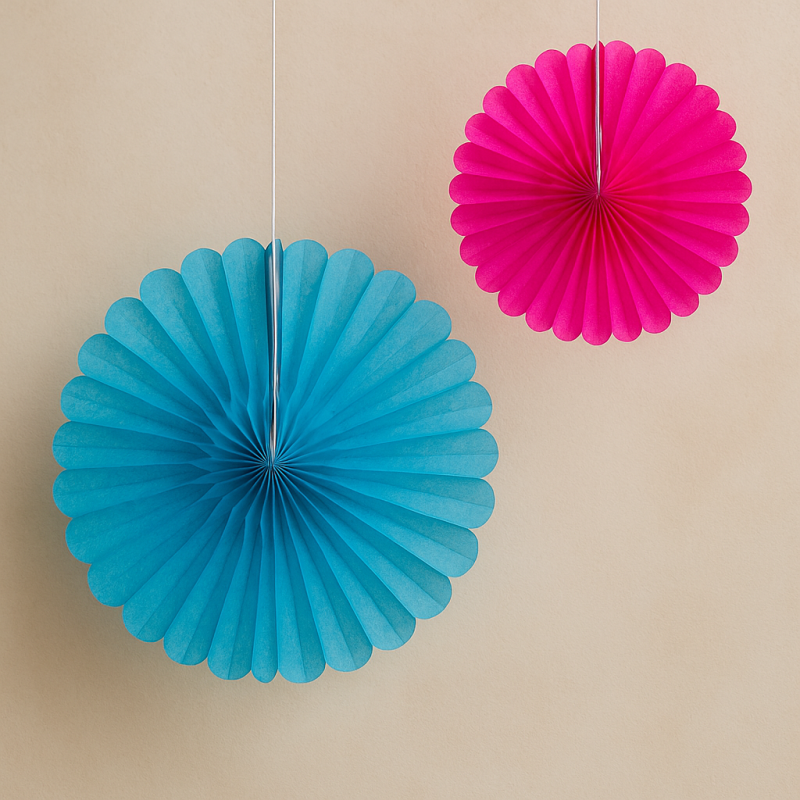 Комплект от 2 броя висящи парти декорации във формата на ветрило, изработени от хартия в цвят тюркоаз и цикламено.