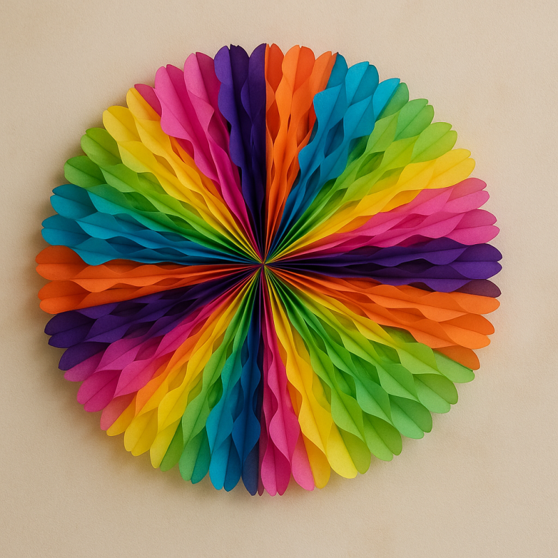 Висяща парти декорация във формата на ветрило, изработена от хартия в цветовете на дъгата.