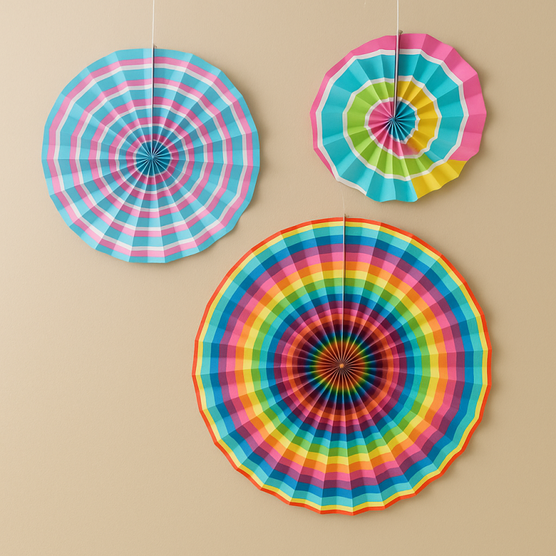 Комплект от 3 броя висящи парти декорации във формата на ветрило с различни размери, изработени от хартия с многоцветни шарки.