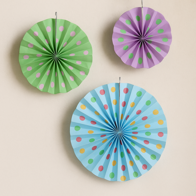 Комплект от 3 броя висящи парти декорации във формата на ветрило с различни размери, изработени от хартия в различни цветове с принт на точки.