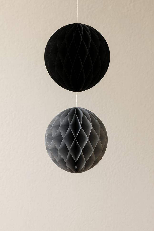 Комплект от 2 броя висящи парти декорации във формата на топка, изработени от хартия в черно и сребристо.