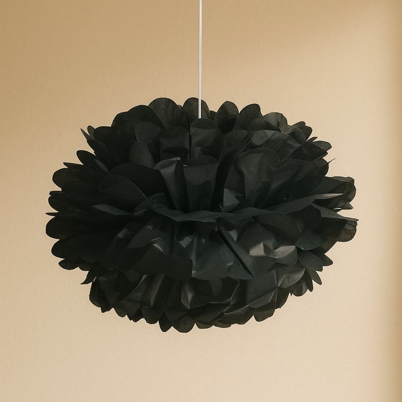 Висяща парти декорация във формата на помпон, изработена от хартия в черен цвят.