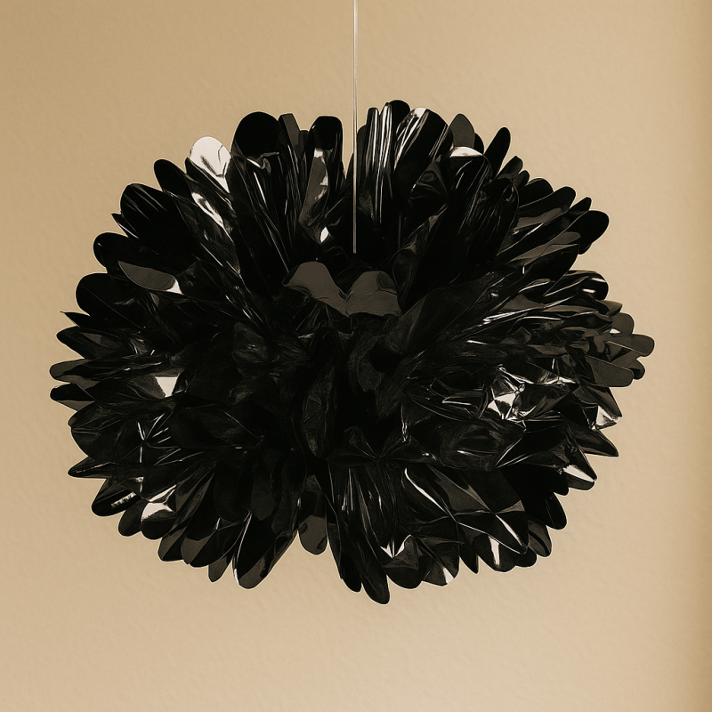 Висяща парти декорация във формата на помпон, изработена от хартия в цвят графит с металически отблясъци.