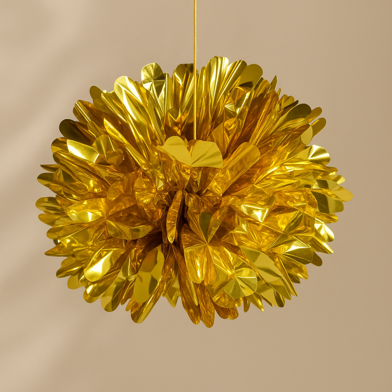 Висяща парти декорация във формата на помпон, изработена от хартия в златист цвят с металически отблясъци.