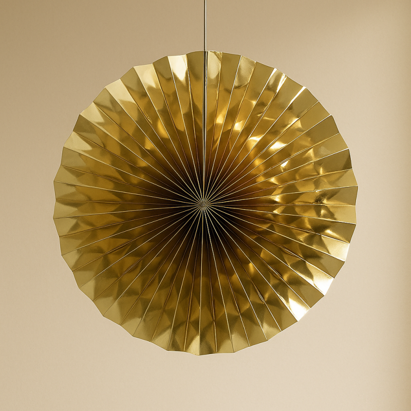Висяща парти декорация във формата на ветрило, изработена от хартия в златист цвят.