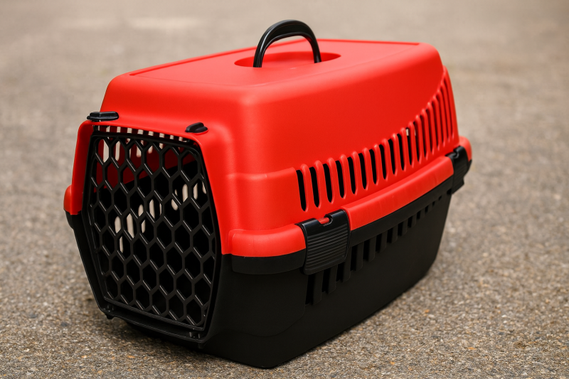 Транспортна клетка за домашни любимци, изработена от твърда пластмаса с желязна врата.