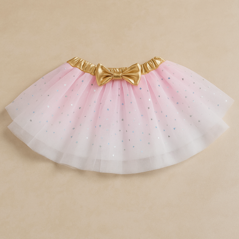 Карнавална поличка за момиче, изработена от полиестер в розов цвят със златист колан с панделка.