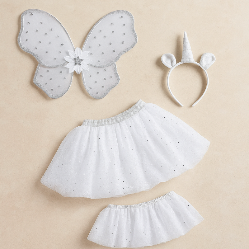 Уникален костюм на еднорог, включващ поличка, диадема с ушички и рог и крила.