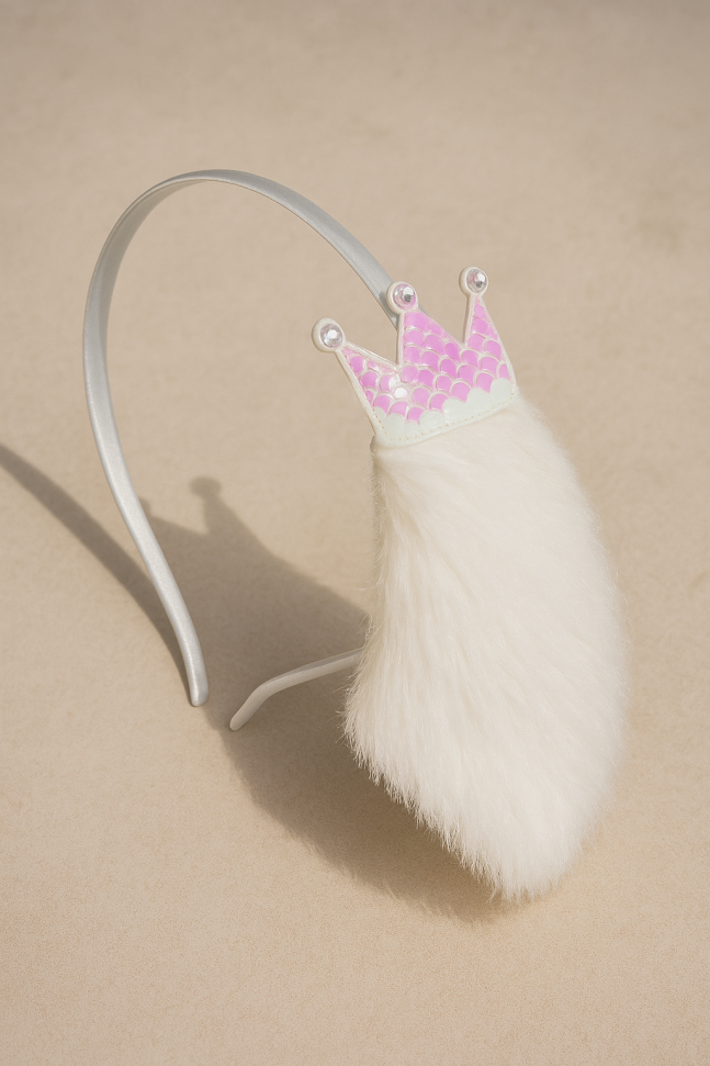 Карнавална диадема в бял цвят с декоративна корона с розови пайети и изкуствена вълна.