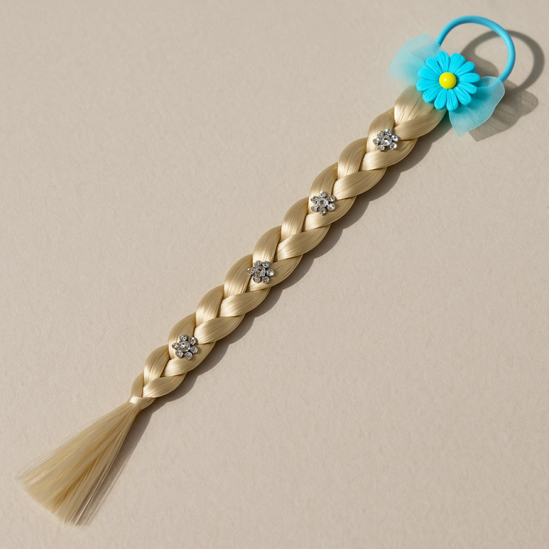 Карнавална руса плитка Снежната кралица с ластик, сърце от тюл в светло син цвят и декоративни снежинки.