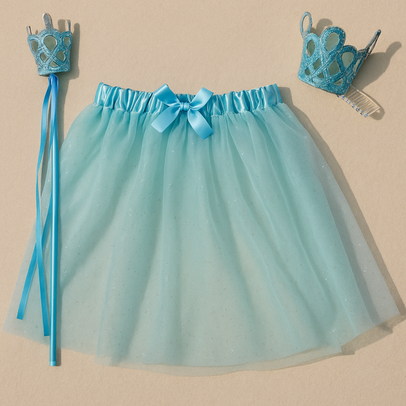 Карнавален комплект Снежната кралица, включващ поличка, корона и жезъл в тюркоазено син цвят с изкуствени кристали, тюл и пайети.
