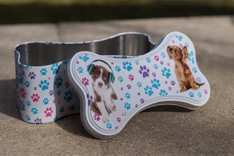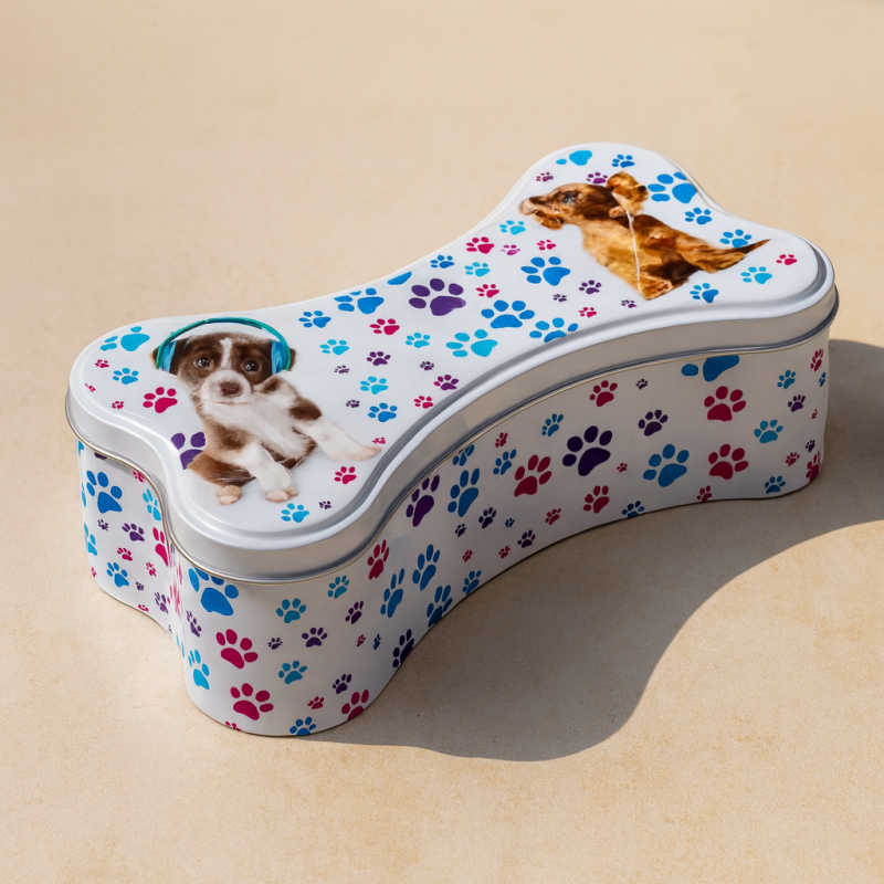 Метална кутия за съхранение на суха храна за кучета във формата на кокал.