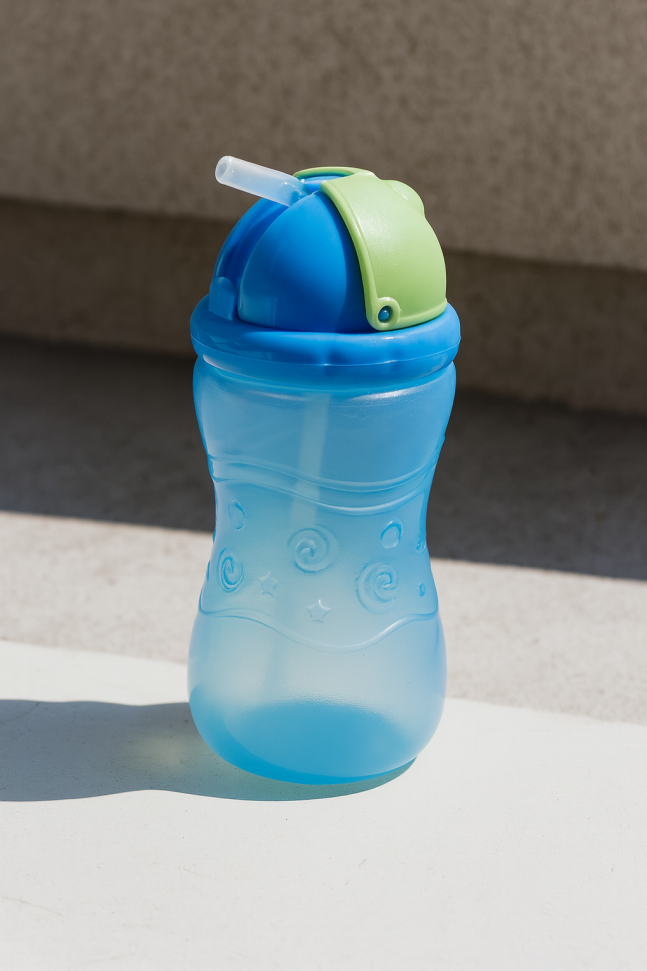 Пластмасова чаша за бебета с удобна форма за лесно захващане и силиконова сламка.