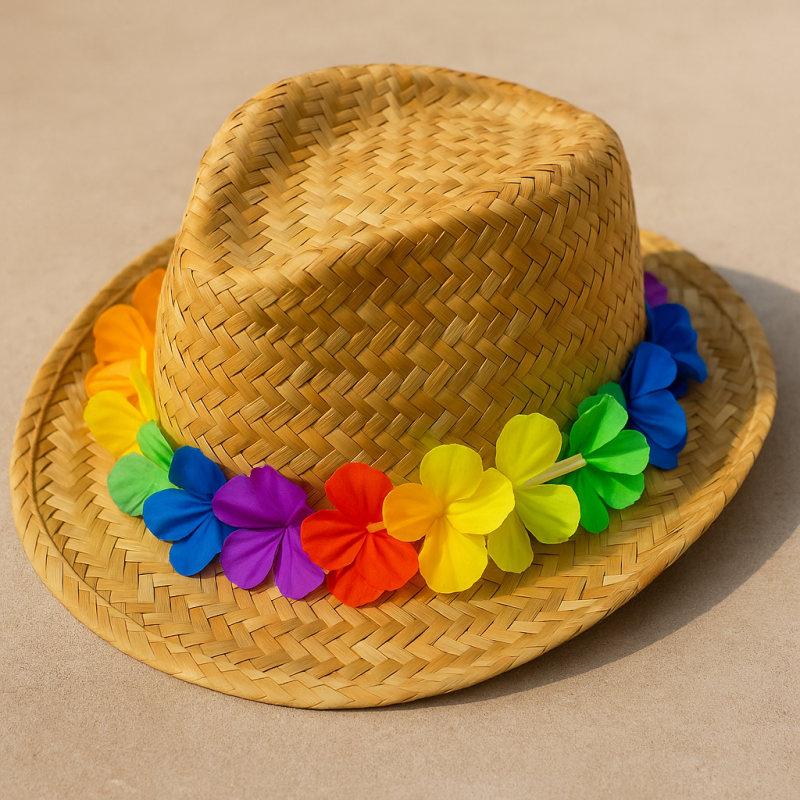 Карнавална сламена шапка тип бомбе в хавайски стил с изкуствени цветя в различни ярки цветове.