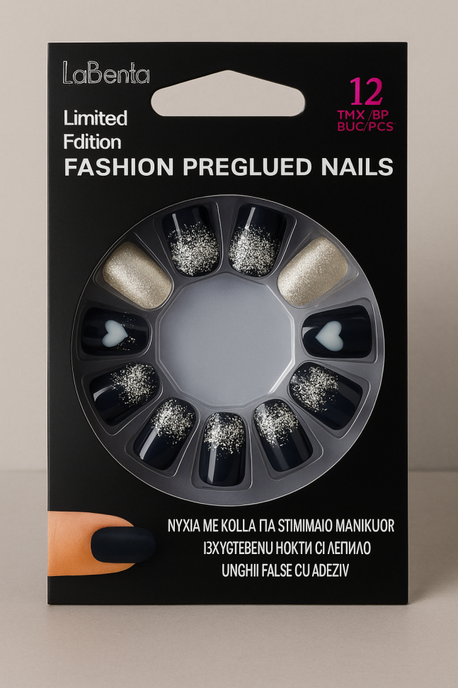Комплект от 12 броя изкуствени нокти в черно и сребристо с лепило.