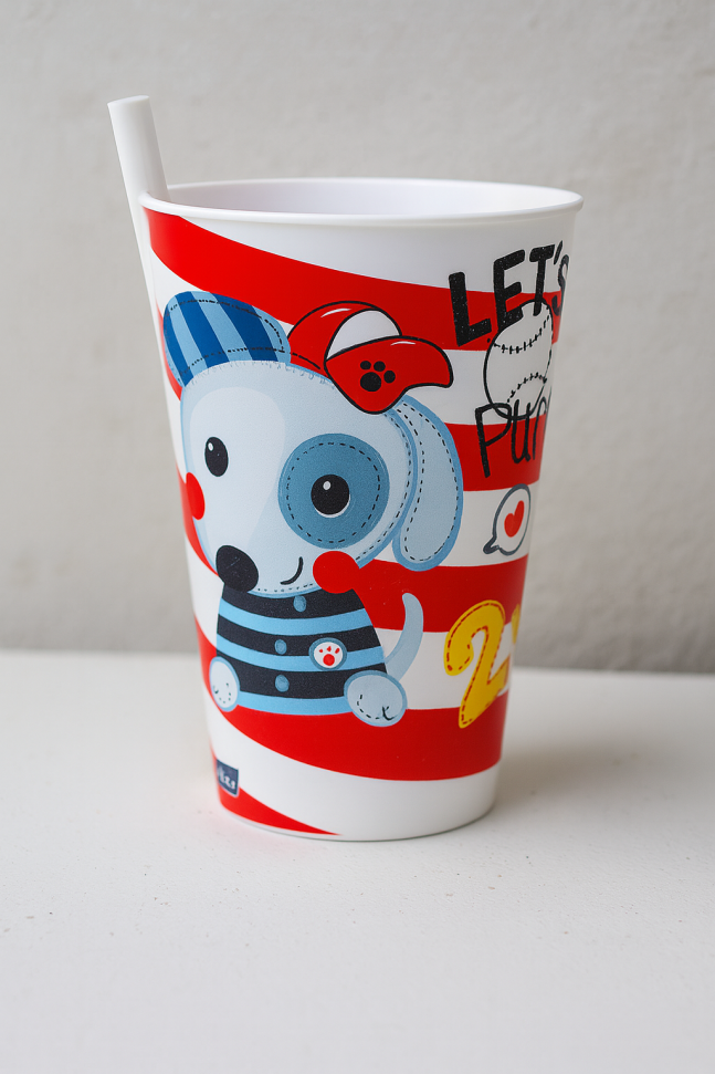 Пластмасова чаша за деца с картинка на куче и вградена сламка.
