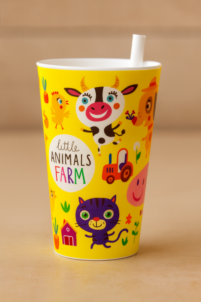 Пластмасова чаша за деца с картинка на животни във фермата и вградена сламка.
