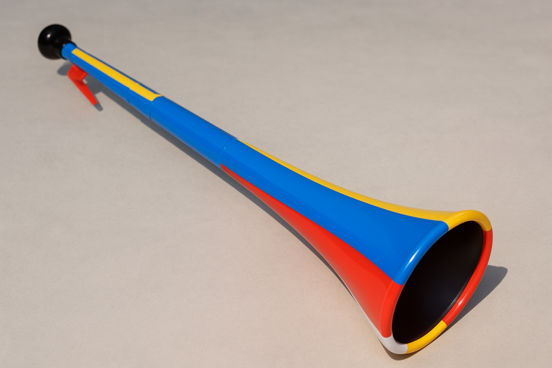 Карнавален тромбон, изработен от пластмаса с многоцветни раирани шарки.