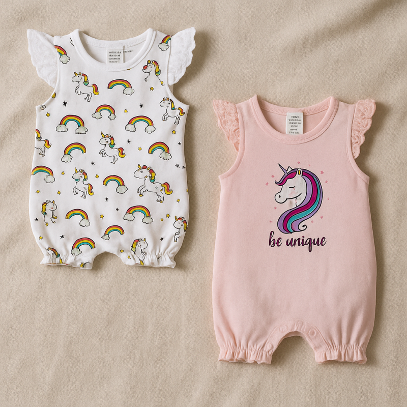 Комплект от 2 броя бебешко боди с волан ръкав, изработено от мека памучна материя в бяло и бледо розово с принт на еднорог.