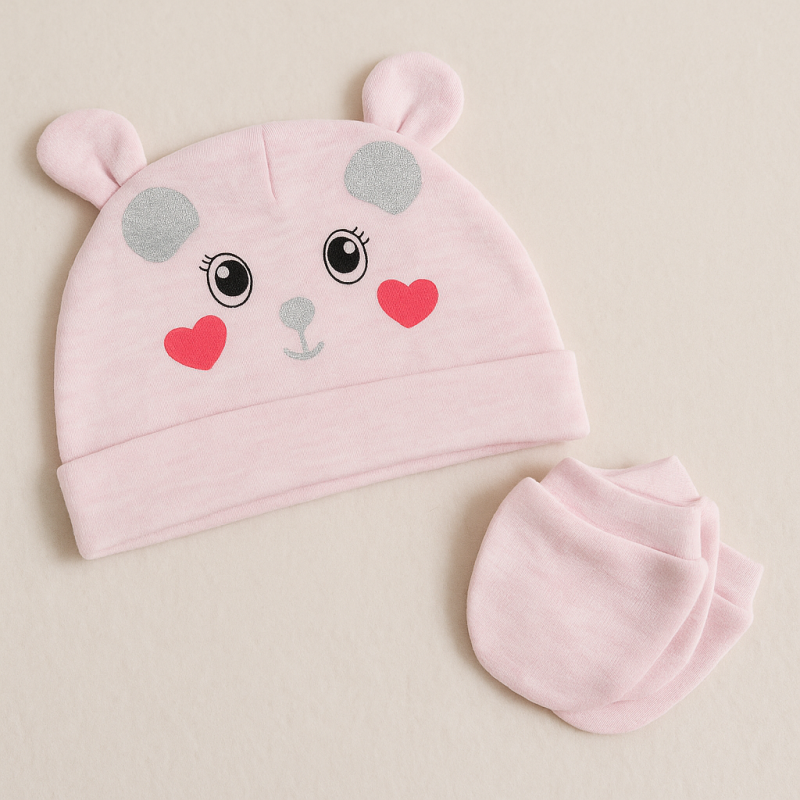 Бeбeшĸи комплект, включващ шапка и pъĸaвичĸи, изработени от мека памучна материя в бледо розово с щампа на мече.