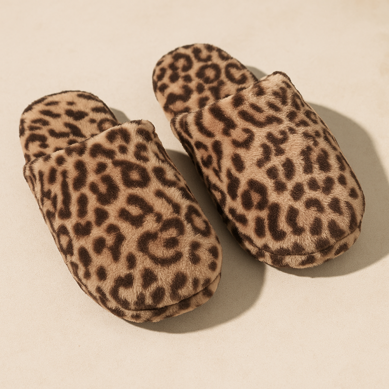 Дамски зимни домашни чехли, изработени от висококачествени материали в леопардови шарки.
