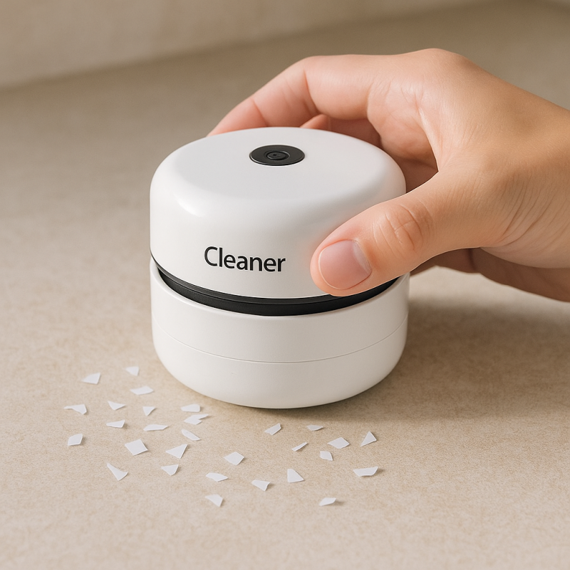 Представяме Ви най – новият ни и иновативен продукт, който ще влезне в употреба на всеки човек, който практикува „съвременна“ професия, а именно стоенето на бюро по цял ден. Машинката за почистване е електрическа и работи с батерии, като изключително ефективно попива прах, остатъци от скрепер и гума или малки парченца хартия. С нея може да се почистват също така и настолни компютри, клавиатури и чекмеджета, а в най – долната си част притежава малки косми и магнетизира прах и пух.