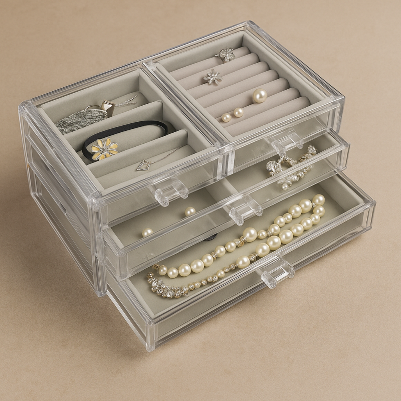 Органайзера за бижута с чекмеджета със сива кадифена подплата може да се превърне в един незаменим аксесоар, който ще внесе ред и ще ви спести време.