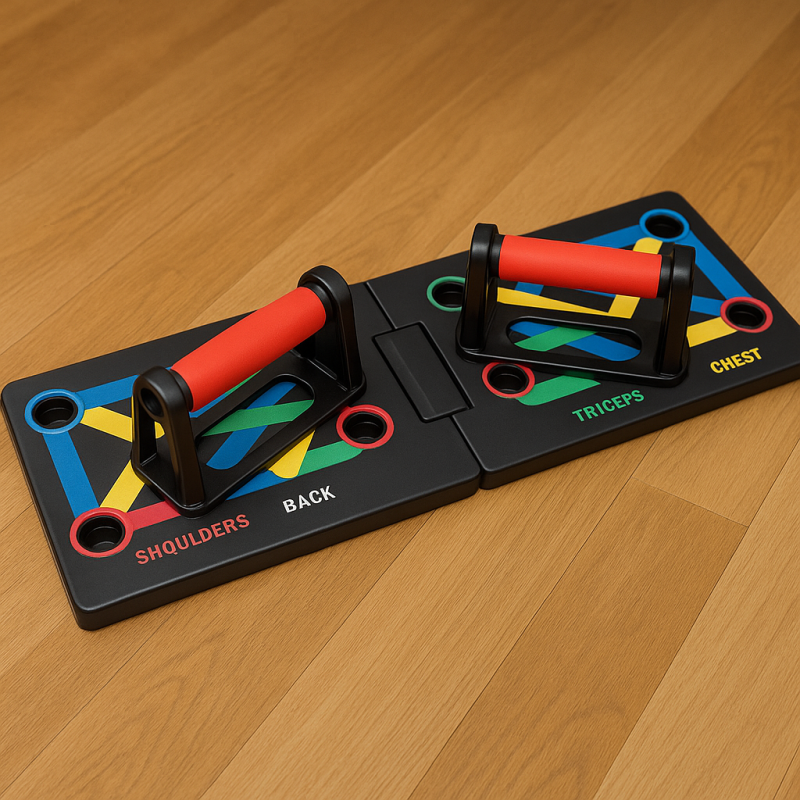 Той представлява сгъваема основа с дръжки за упражнения, а ако желаете да смените позицията на дръжките можете да тренирате различни мускулни групи. Следвайки цветните съвети можете да упражнявате мускулите на раменете (червено), трицепсите (зелено), гърдите (синьо) или гърба (жълто). Основата се сгъва за лесно транспортиране и съхранение, е безопасна и удобна, лека и издръжлива и със стикерите за долната страна е противоплъзгаща. Приблизителните размери на опаковката са 34 x 8 x 20 см.
