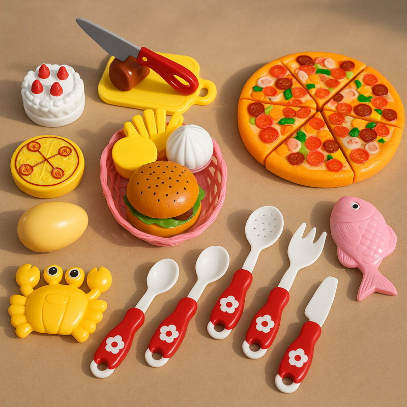 Комплекта представлява реалистични играчки за храна, сладкиши и напитки и заедно поднос за рязане и прибори, чрез който децата Ви ще могат да приготвят любимото си ястие за вас и вашите приятели ! Детския комплект е подходящ както за момчета, така и за момичета, като предпочитаната възраст за използване трябва да е над три години. Приблизителните размери на опаковката са 39 х 6 х 35 см., а материалите, от който е направен комплекта са напълно безвредни и подходящи за многократна употреба.