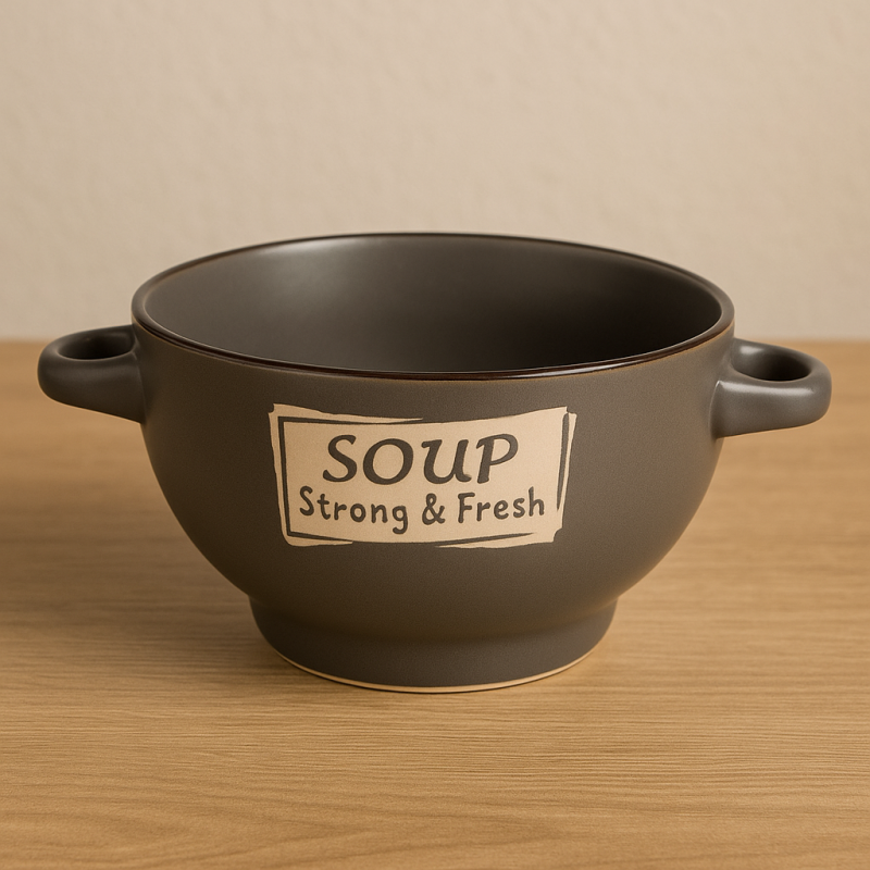 Купа за супа с дръжки, изработена от термоустойчива керамика в бежов цвят и релефна лепенка с надпис "SOUP strong & fresh"