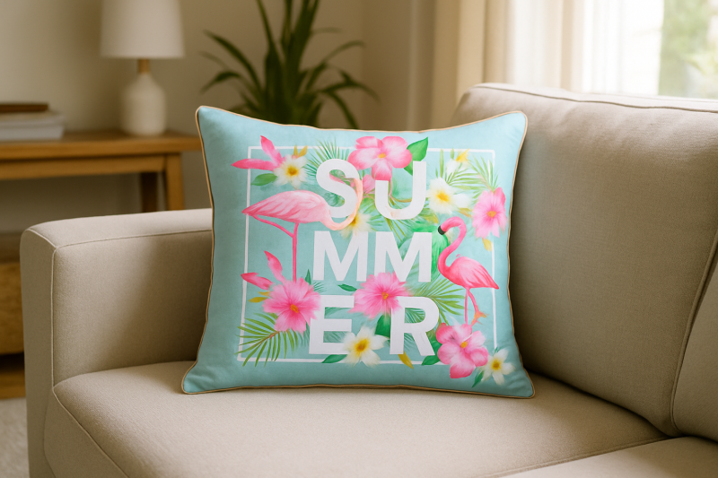 Красива декоративна възглавница с щампа на фламинго и цветя.