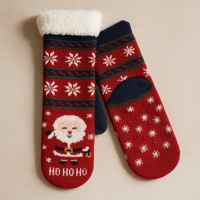 - Дизайн: Червен жакард с Дядо Коледа и надпис "Ho-Ho-Ho", сини и зелени детайли.