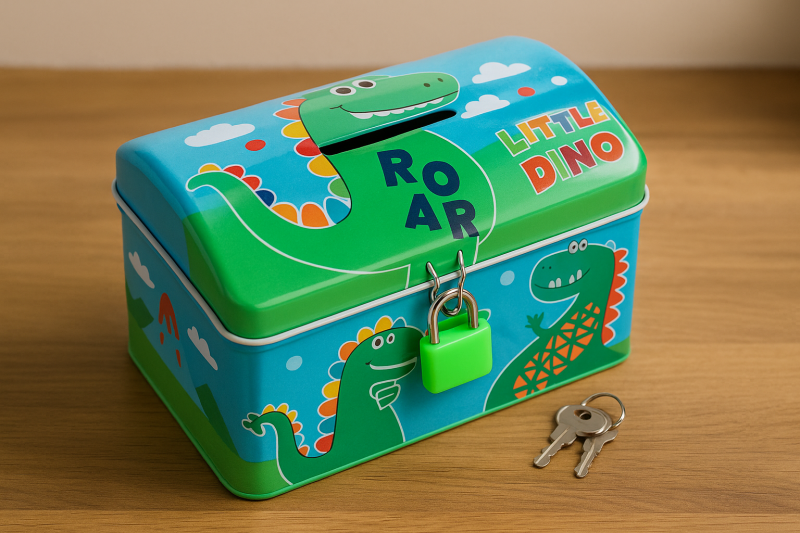 Детска касичка с катинарче Дино – забавна и сигурна метална касичка за момче с дизайн на динозавър. Съдържа ключалка и два ключа. Компактни размери 12.5 x 8 x 7.5 см.