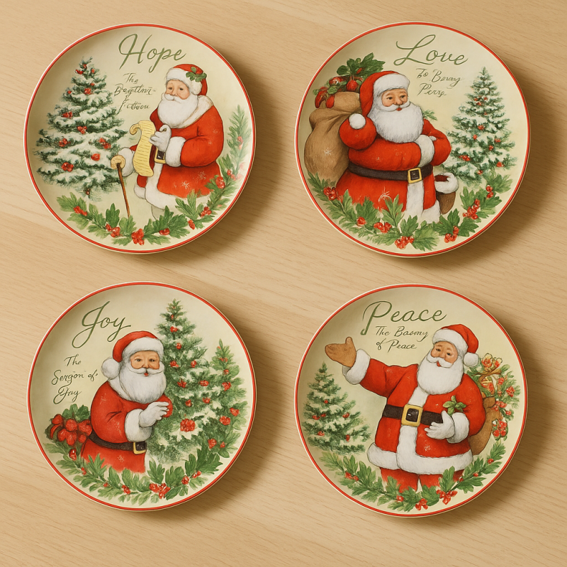 Добавете празничен дух с комплект коледни чинии - Ø19см - 4 бр. от порцелан с винтидж дизайн на Дядо Коледа. Перфектни за сервиране и декорация на коледната трапеза.
