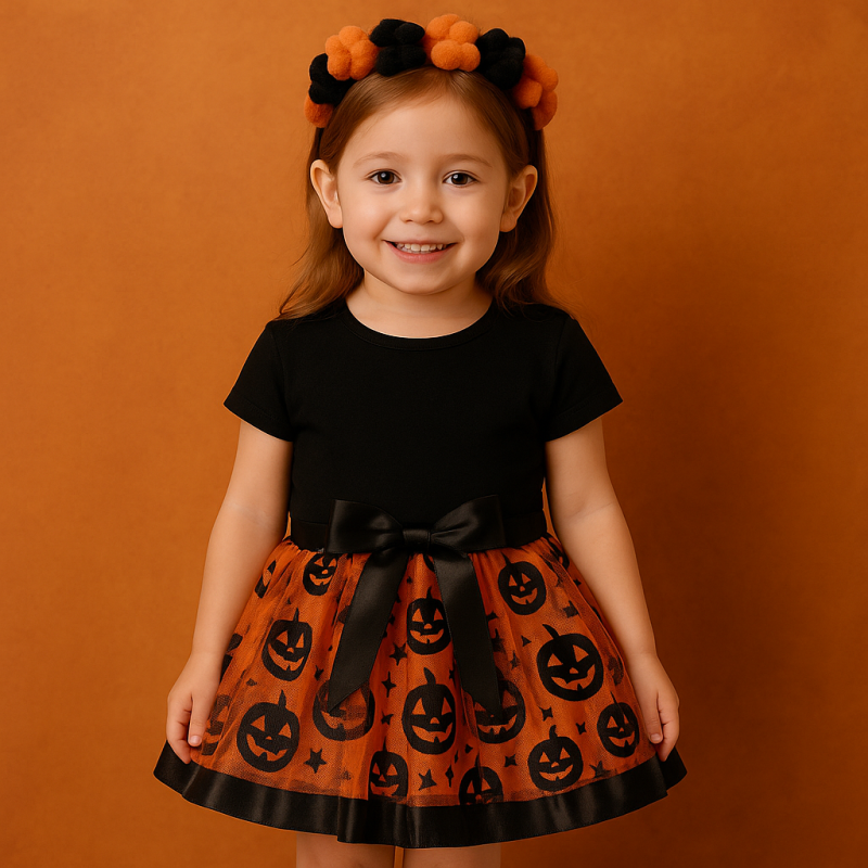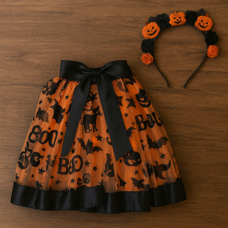 Костюмът включва пола ту-ту изработена от мек оранжев тюл с тематични Хелоуин мотиви и черна панделка в талията. Благодарение на ластичната талия, полата осигурява удобно и гъвкаво прилягане, подходящо за различни възрастови групи. Материите са леки и приятни на допир, което гарантира удобство при движение и игри.